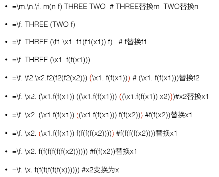 我们可以更加正式的说:a. 所有变量都是λ形式(所有变量都是合法的λ表达式); b. 如果x和y是λ形式,那么(xy)是λ形式; c. 那么(λx.y)是λ形式。通过这三条规则,我们可以写出所有的λ表达式。如果我们从左向右读λ表达式,我们可以少写一些括号:(λy.xy) ab是 (((λy.(x y)) a) b)的化简版。